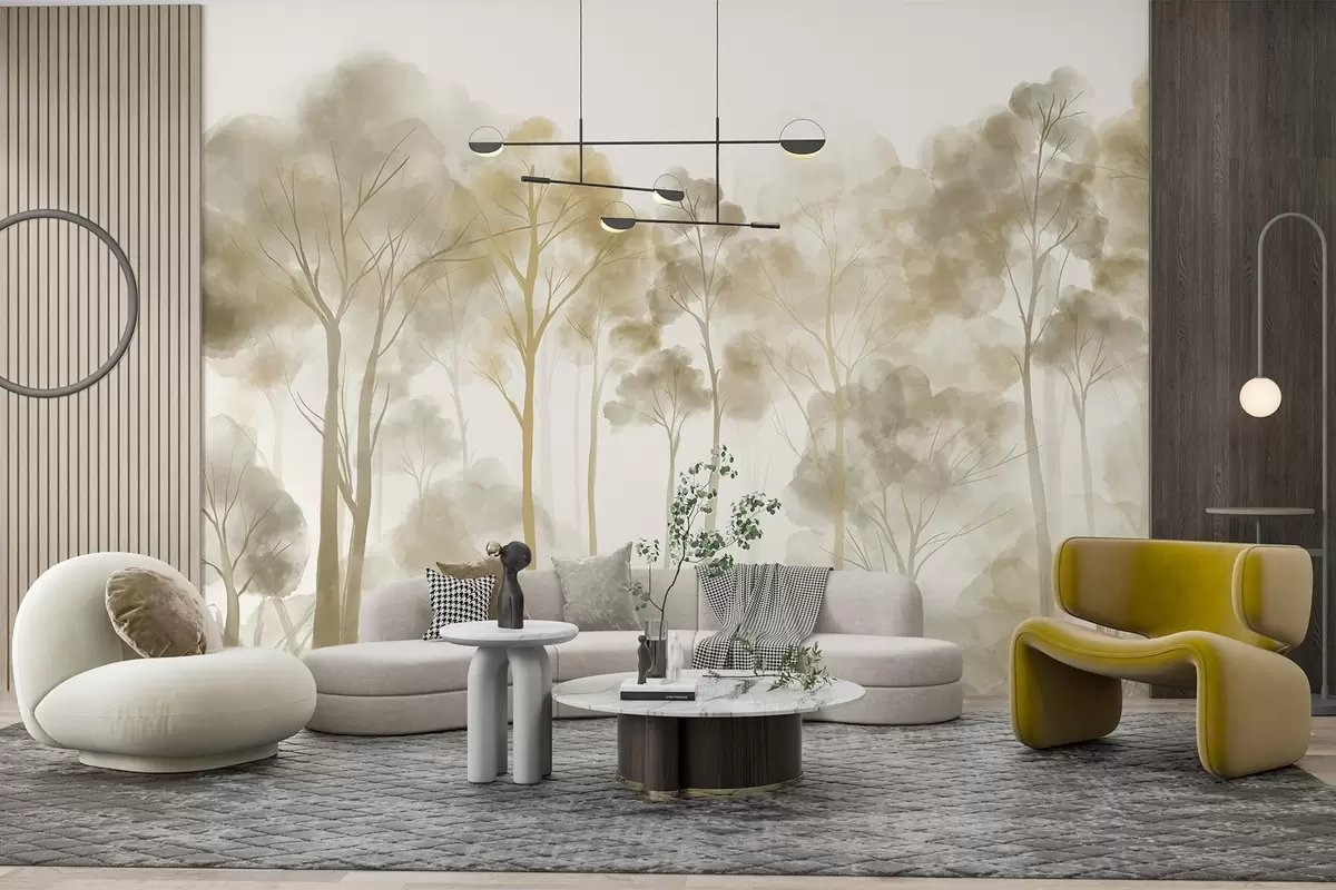 Fotobehang Bos in aquarelstijl met hoge lichtgekleurde bomen in beige en gele tinten, met een mistige sfeer N° w08870