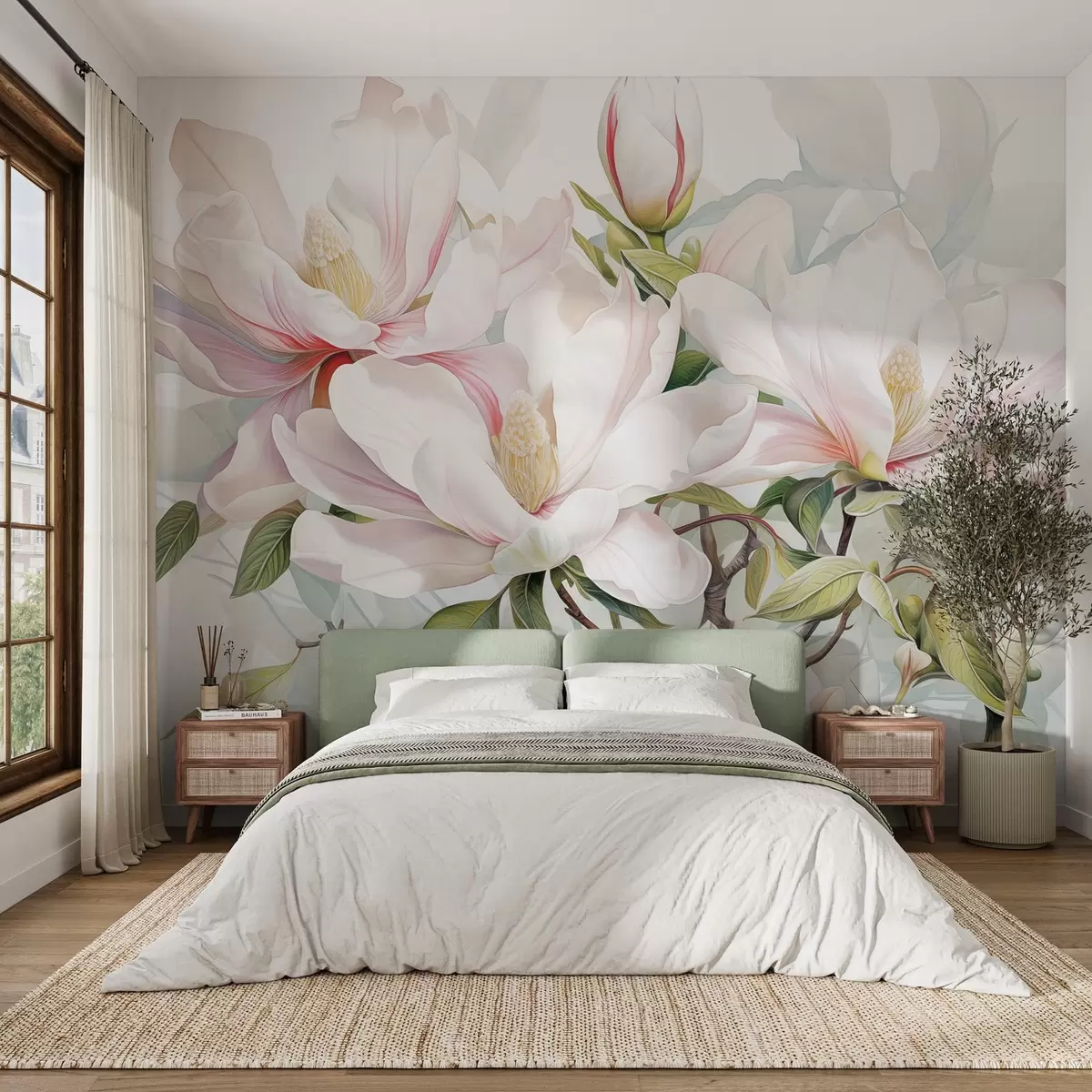 Fotobehang Magnolia bloemen met witte en roze bloemblaadjes, bladeren en bruine takken, zachte en delicate aquarelstijl N° w08885