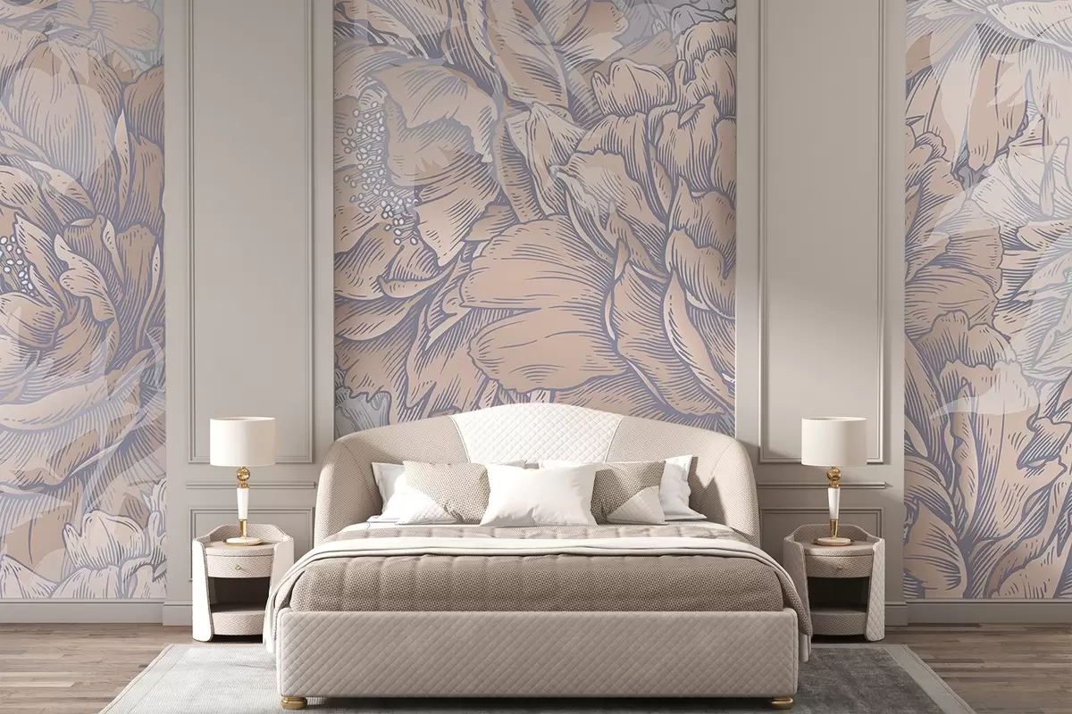 Fotobehang Pioenbloemen met gedetailleerde bloemblaadjes en meeldraden, zachte pastelkleuren, vintage botanische illustratiestijl N° w08890