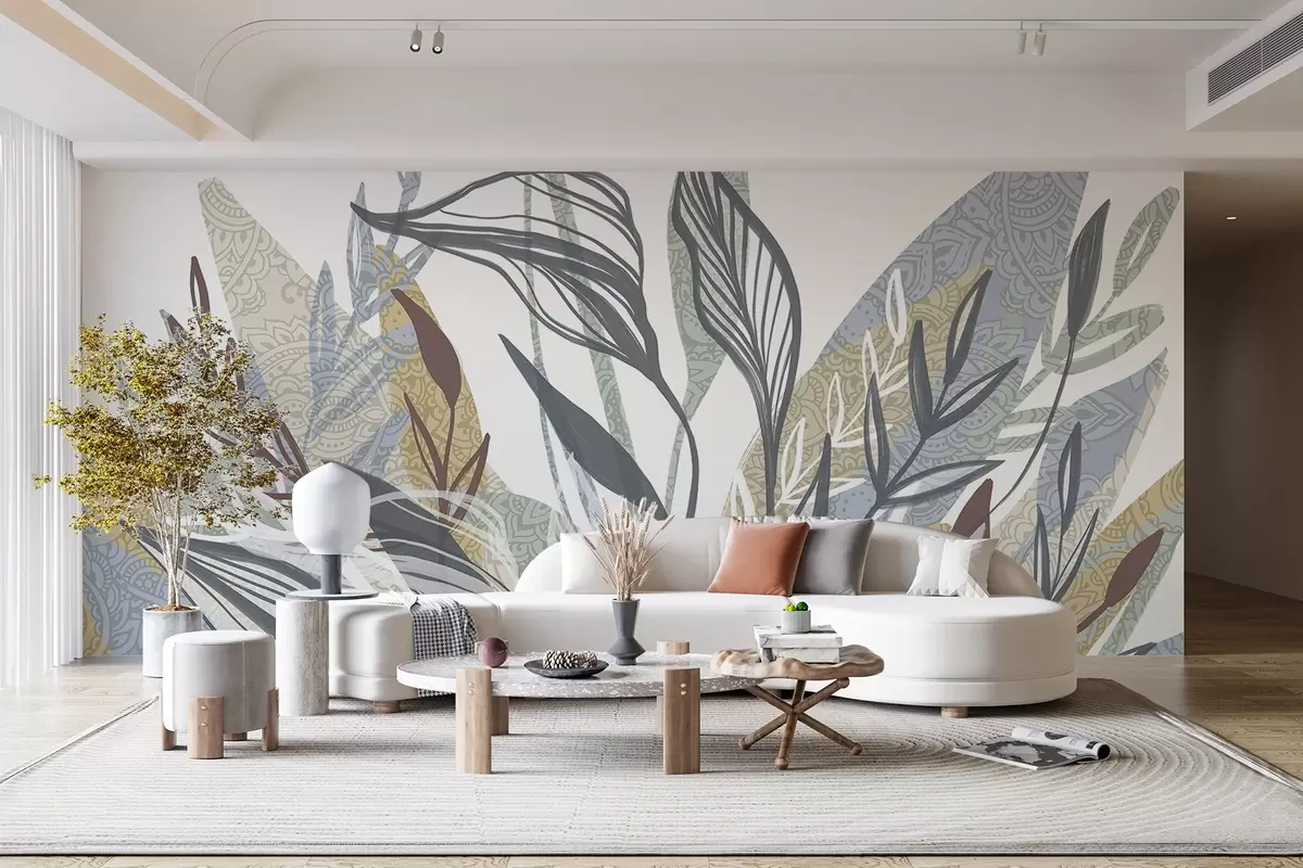 Fotobehang Een verzameling bladeren met verschillende kleuren en afmetingen, sommige met lijntekening, op een witte achtergrond N° w08893