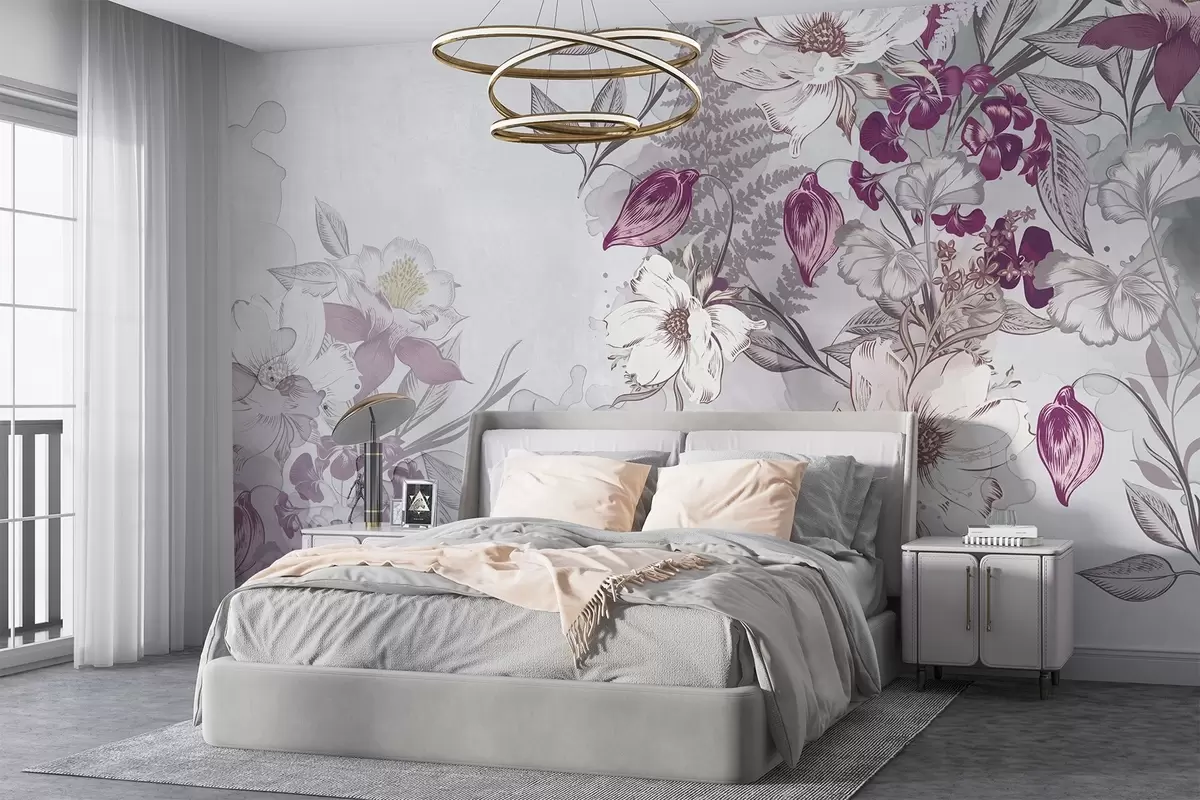 Fotobehang Bloemen met witte en paarse bloemblaadjes, bladeren en stengels , aquarel effect , lichtgrijze getextureerde achtergrond N° w08899
