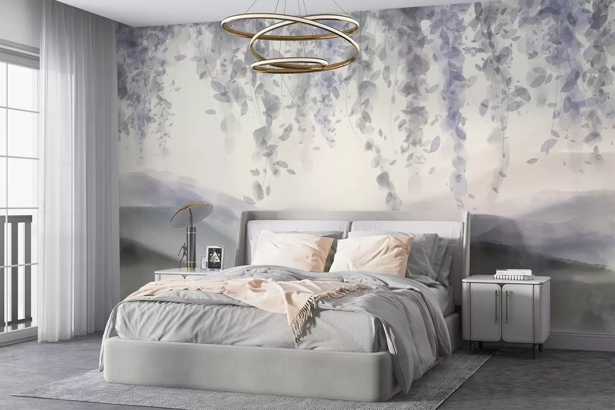 Fotobehang Wisteria bladeren hangend over bergen, zachte pastel blauwe en grijze kleuren, aquarel stijl landschap N° w08909