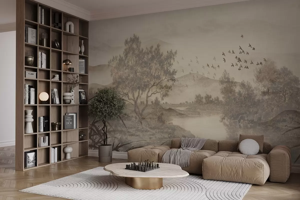Fotobehang Textuur vintage landschap met een boom bij een rivier en een bewolkte lucht, natuurkunst in sepiatinten N° w08920