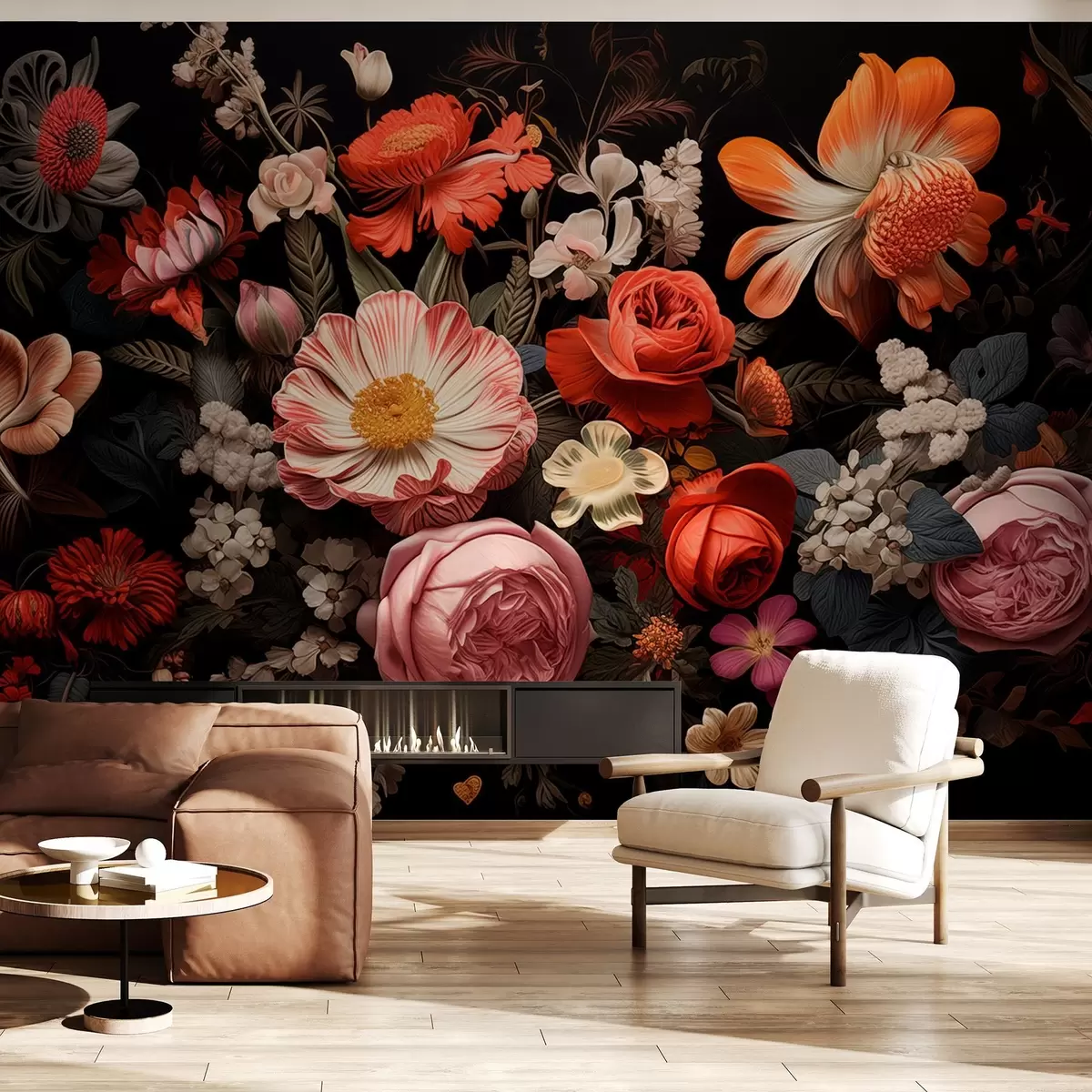 Fotobehang Kleurrijk boeket van verschillende bloemen op een donkere achtergrond in warme tinten N° w08969