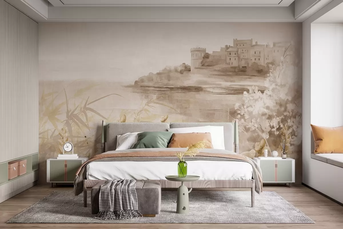 Fotobehang Vintage landschap met een kasteel op een klif met uitzicht op zee, met lavendel bloemen in gedempte kleuren N° w08975v1