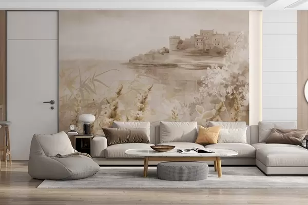 Fotobehang Vintage landschap met een kasteel op een klif met uitzicht op zee, met lavendel bloemen in gedempte kleuren N° w08975v1