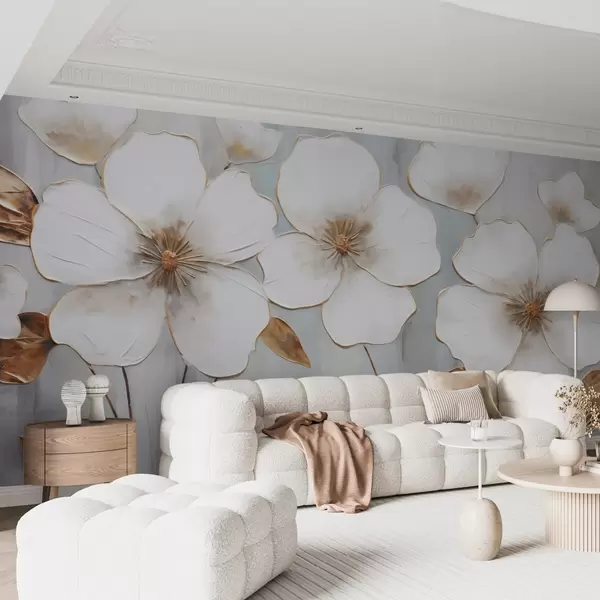 Fotobehang Grote witte bloemen met gele accentblaadjes op een grijze achtergrond N° w08999