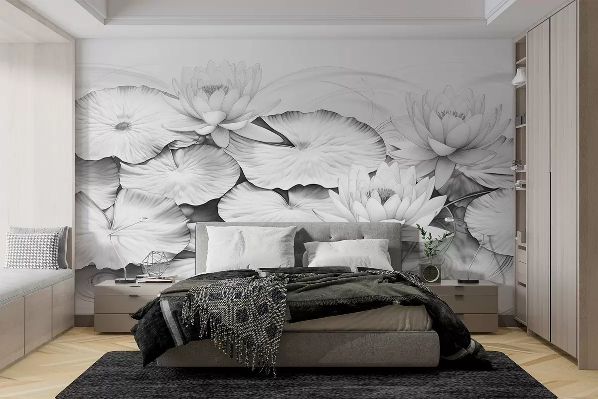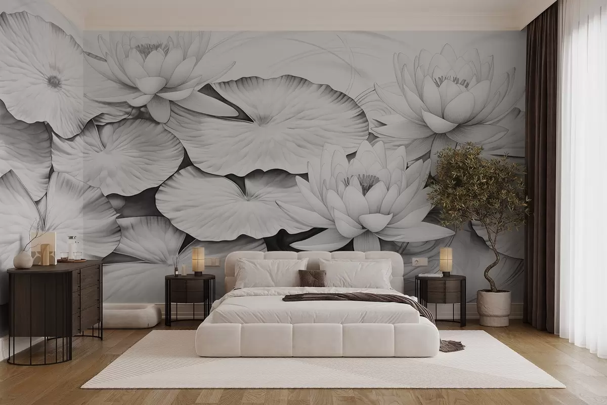 Fotobehang Waterlelies en lelieblad in een vijver, zwart-wit imitatie van potloodtekening, gedetailleerde botanische illustratie, natuurkunst N° w09006