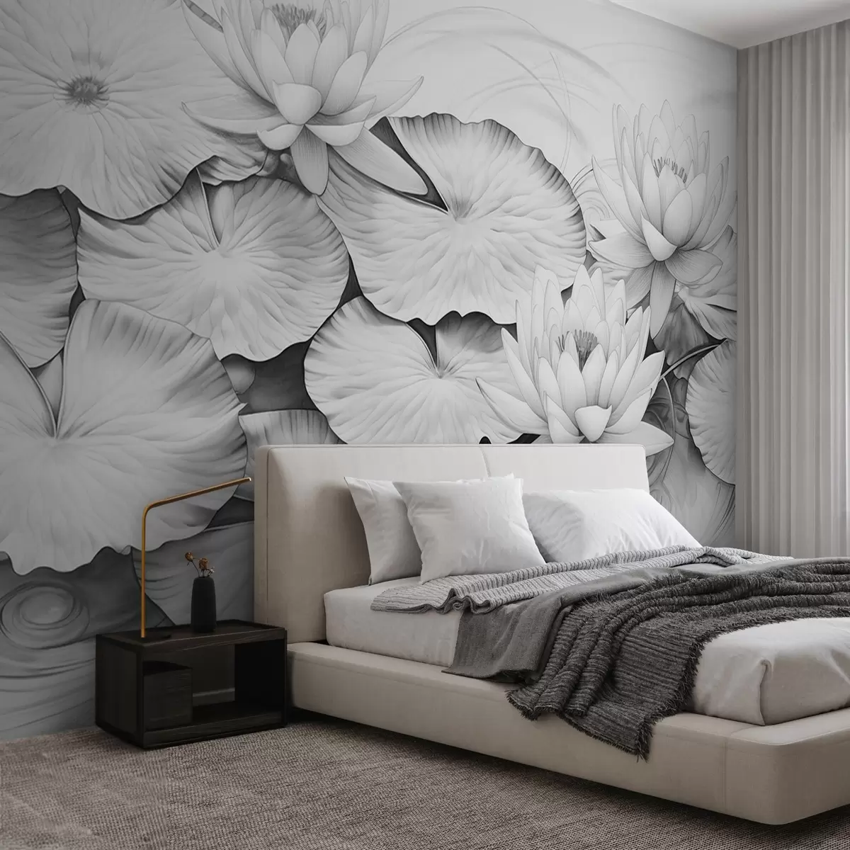 Fotobehang Waterlelies en lelieblad in een vijver, zwart-wit imitatie van potloodtekening, gedetailleerde botanische illustratie, natuurkunst N° w09006
