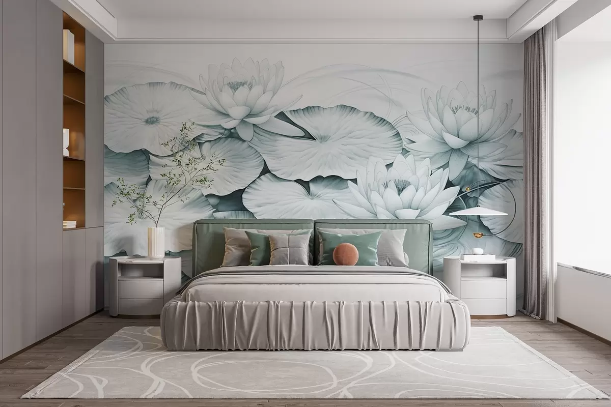 Fotobehang Waterlelies en lelieblad in een vijver, turquoise en witte imitatie van potloodtekening, gedetailleerde botanische illustratie, natuurkunst N° w09006v1