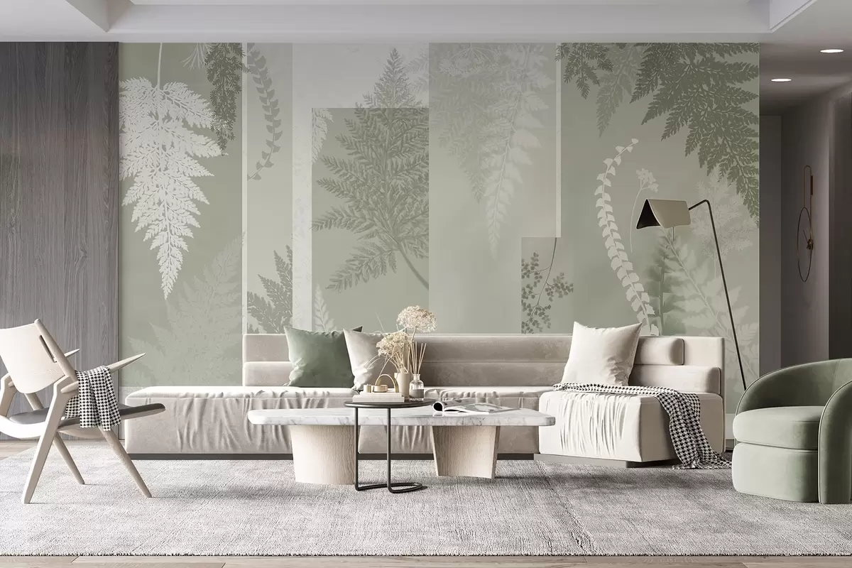 Fotobehang Varensbladeren in groen en wit, gerangschikt in verticale strepen, waardoor een botanische en minimalistische print ontstaat, zachte en gedempte kleuren N° w09007v2