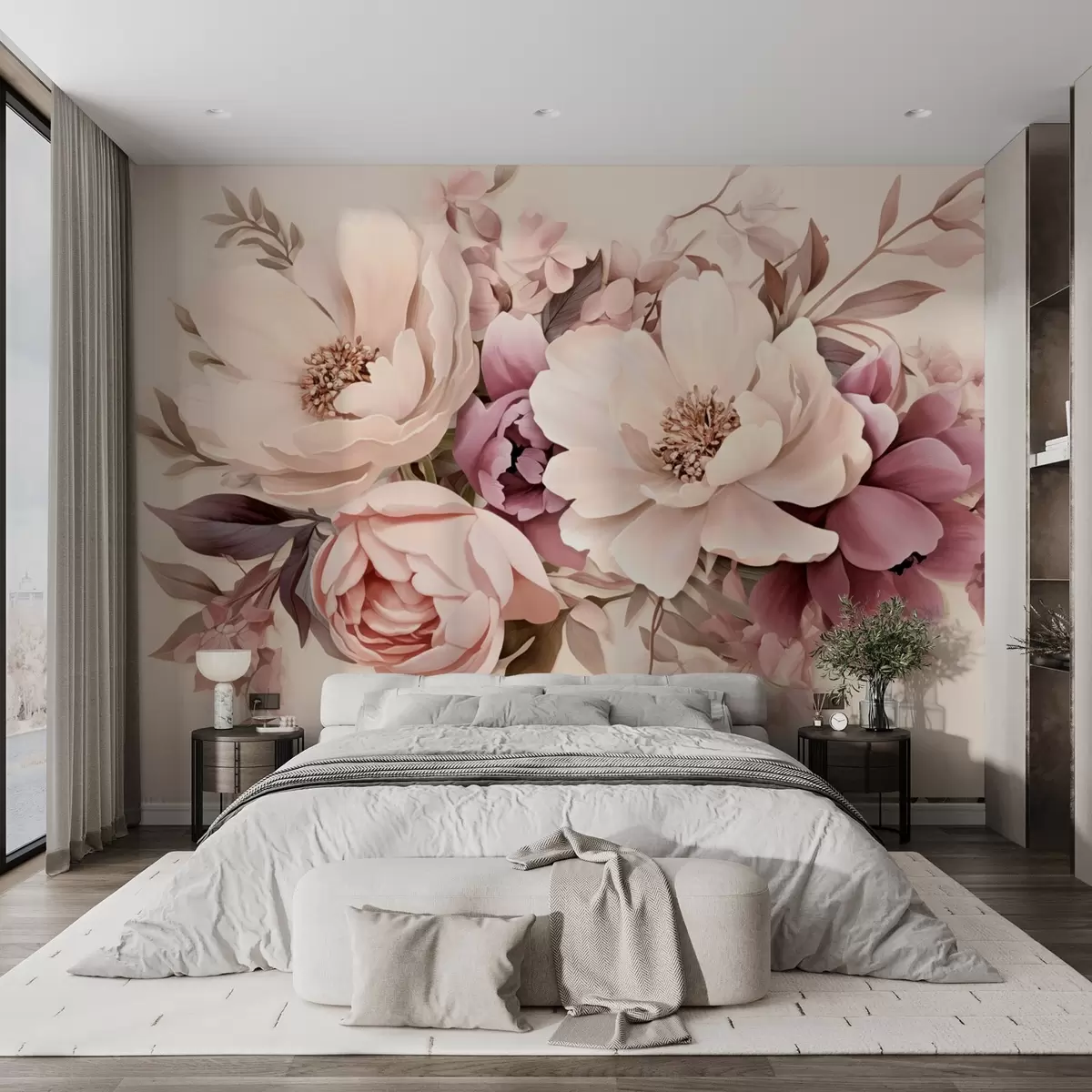 Fotobehang Delicate compositie van roze en beige bloemen, pioenen met bladeren N° w09019