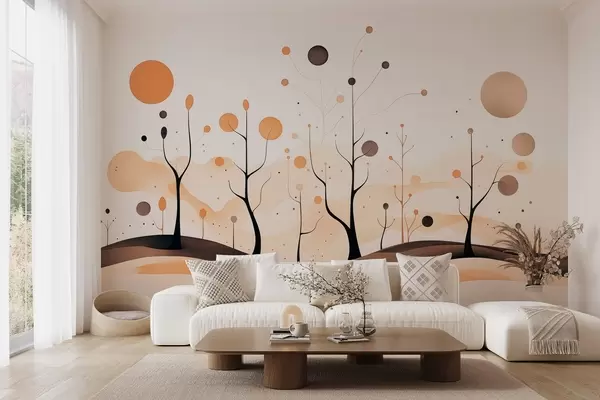 Fotobehang Abstracte bomen met bollen en zon in beige-grijze tinten N° w09043