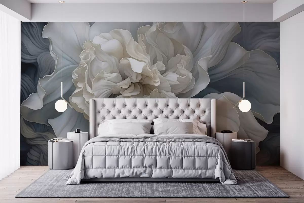 Fotobehang Abstracte grote decoratieve bloem met veel bloemblaadjes, zacht en delicaat, met blauwe en grijze tinten op de achtergrond N° w09055