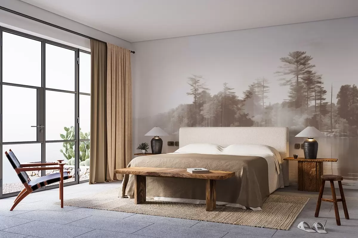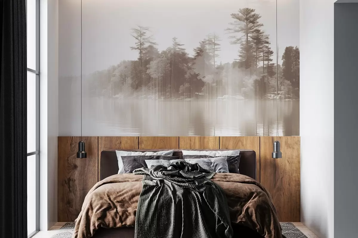 Fotobehang Abstract minimalistisch textuurlandschap met een meer en bomen die weerspiegelen in het water in beige en witte tinten N° w09058v1