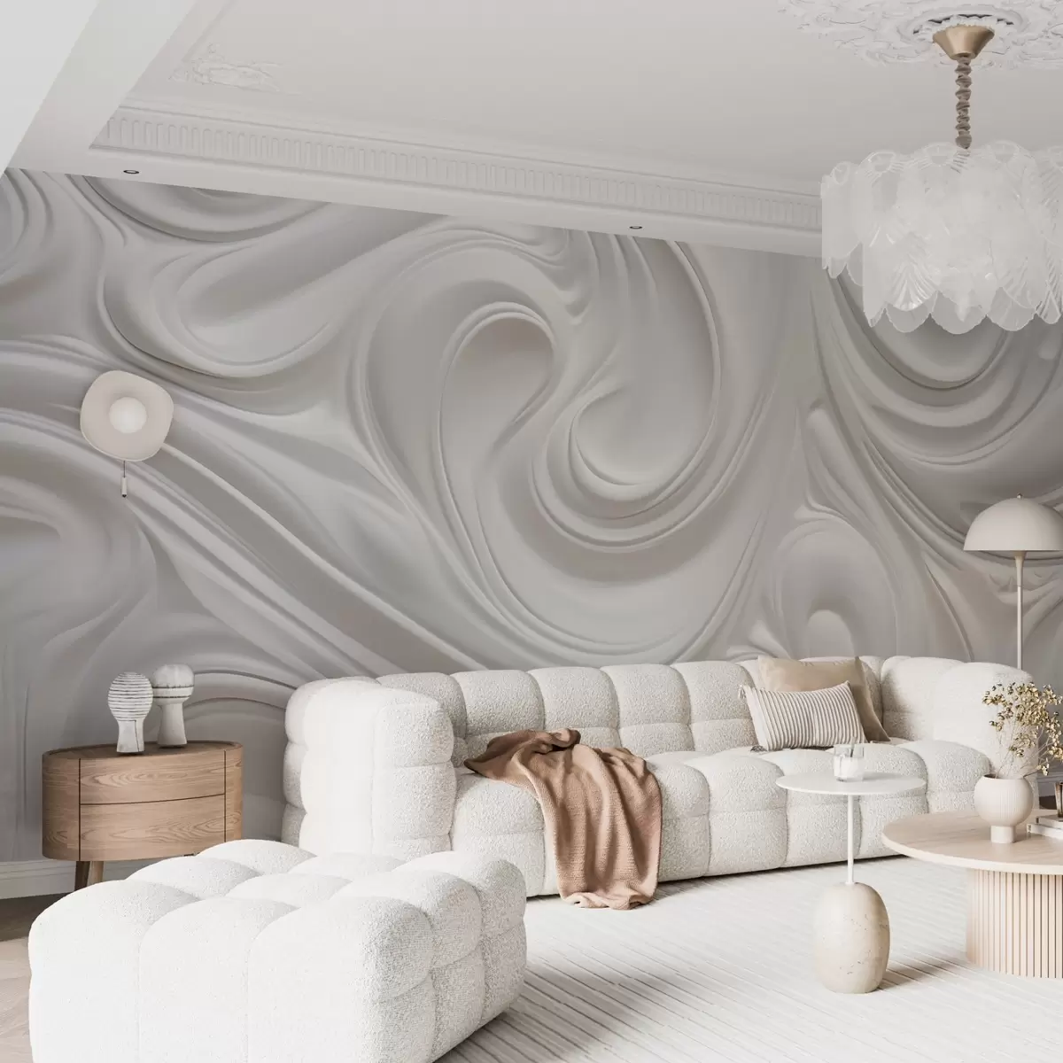 Fotobehang Witte abstracte moderne kunst met vloeiende wervelingen en golven, gladde textuur, elegant ontwerp, minimalistische esthetiek w09059