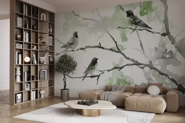 Fotobehang Vogels op boomtakken in aquarelstijl N° w09064v3