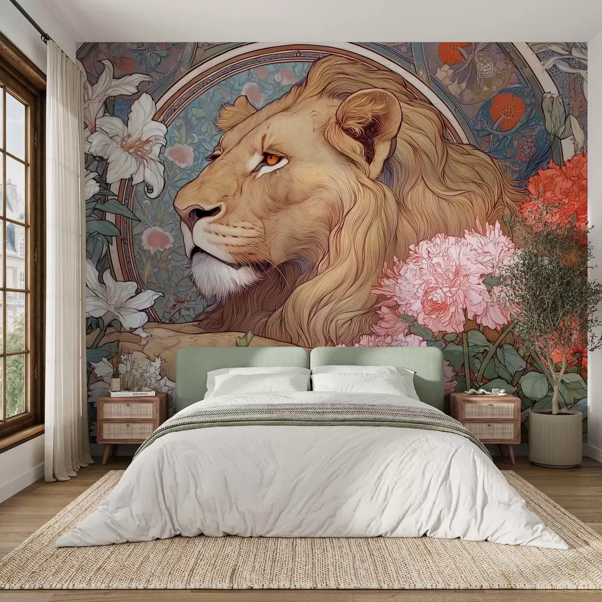 Fotobehang Een leeuw omringd door vele bloemen in de stijl van Alphonse Mucha N° w09073