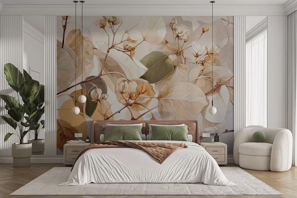 Fotobehang Takken van espenbladeren en bloemen in olieverfschilderijstijl in beige tinten N° w09082