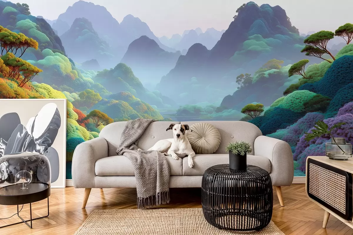 Fotobehang Berglandschap met een rivier in blauwe tinten met bomen en struiken N° w09088