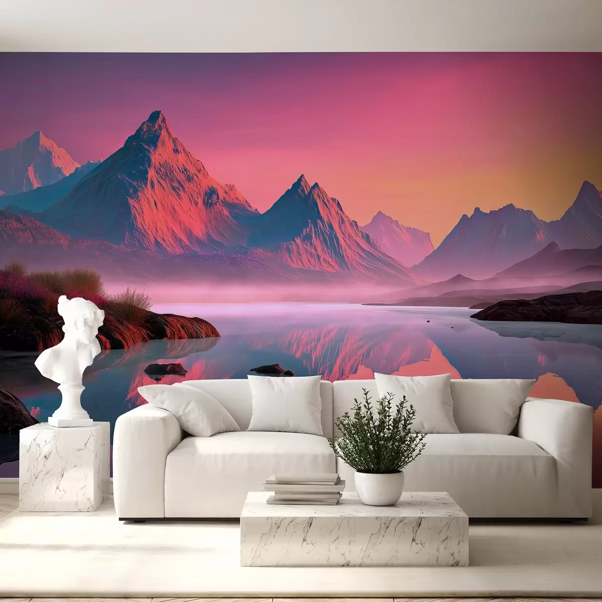 Fotobehang Romantisch landschap bij zonsondergang met een rivier en bergen in roze tinten N° w09093