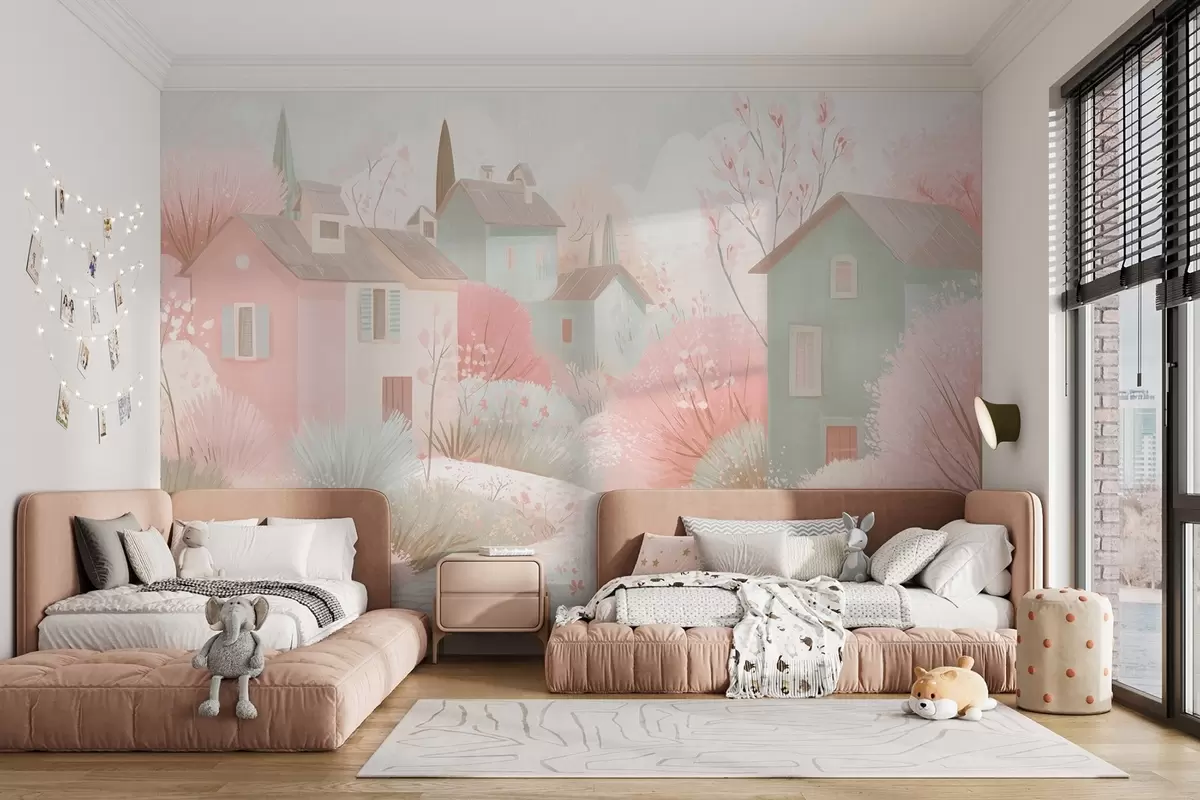 Fotobehang Sprookjesachtige stad in olieverfstijl in roze tinten N° w09095