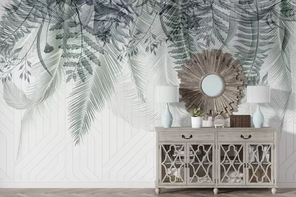 Fotobehang Gevoelige vallende tropische varen en palmbladeren, geometrische achtergrond, zacht licht, gedempte kleuren, elegant N° w09106