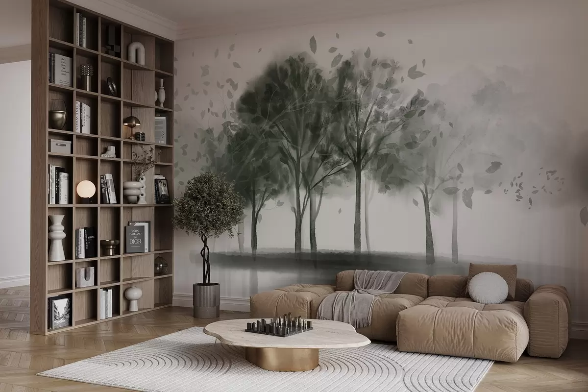 Fotobehang Abstract landschap met bomen met groene bladeren die weerspiegelen in het water, in aquarel structuurstijl N° w09109