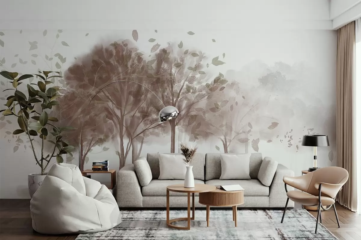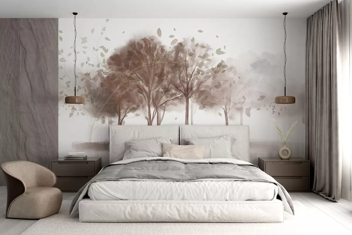 Fotobehang Abstract landschap met bomen met bruine bladeren die weerspiegelen in het water, in aquarel structuurstijl N° w09109v1
