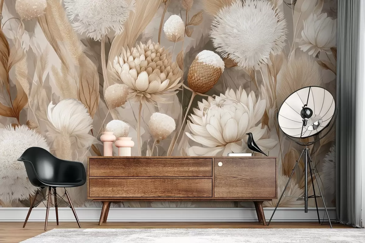 Fotobehang Boho harmonie: Bloemen met structuur in beige en crèmetinten N° w09121