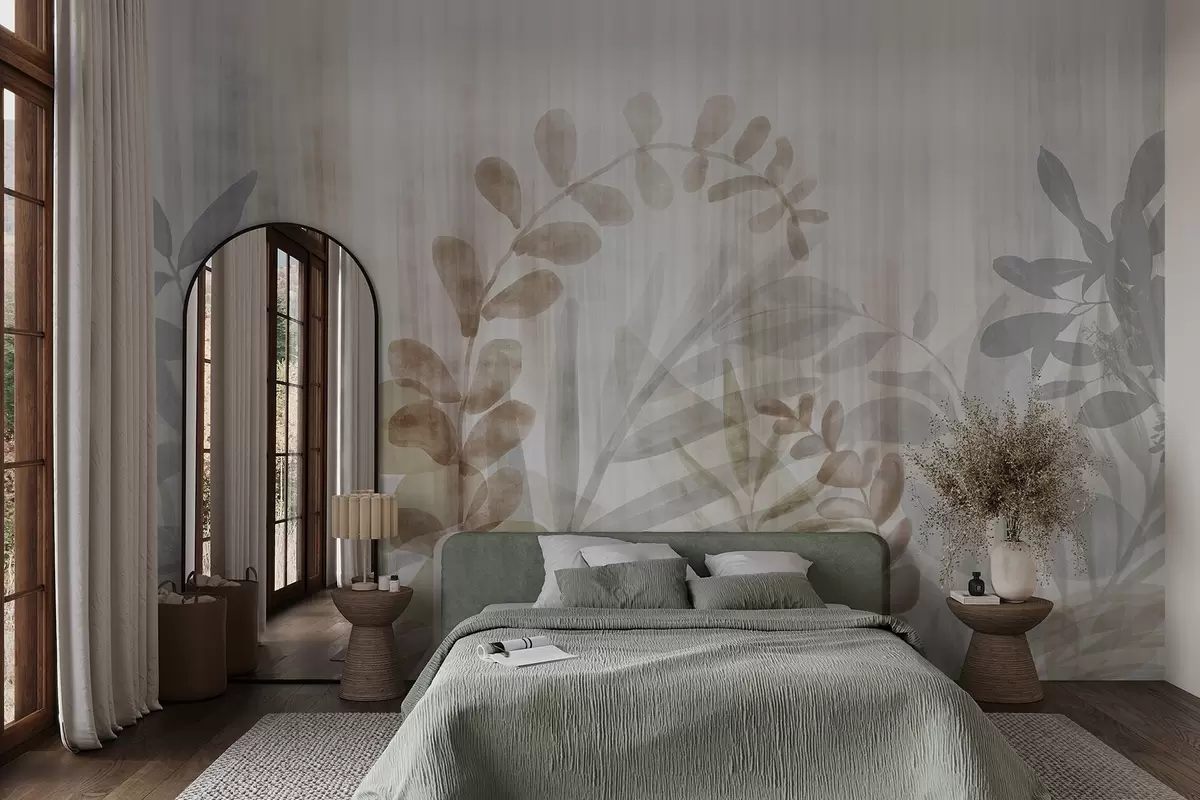 Fotobehang Aquarel imitatie van planten met veelkleurige gedempte bladeren, lichte achtergrond met verticale lijnen, botanische illustratie N° w09146