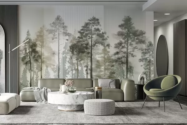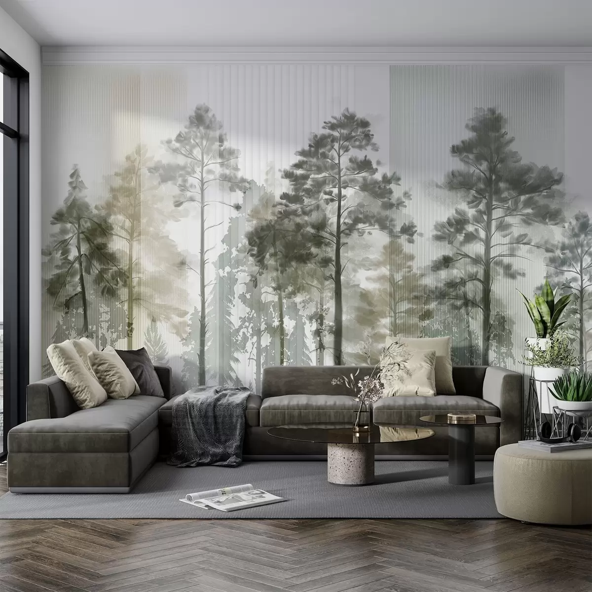 Fotobehang Een dicht bos met hoge dennenbomen, weelderig groen gebladerte, een mistige sfeer met verticale lijntexturen N° w09163