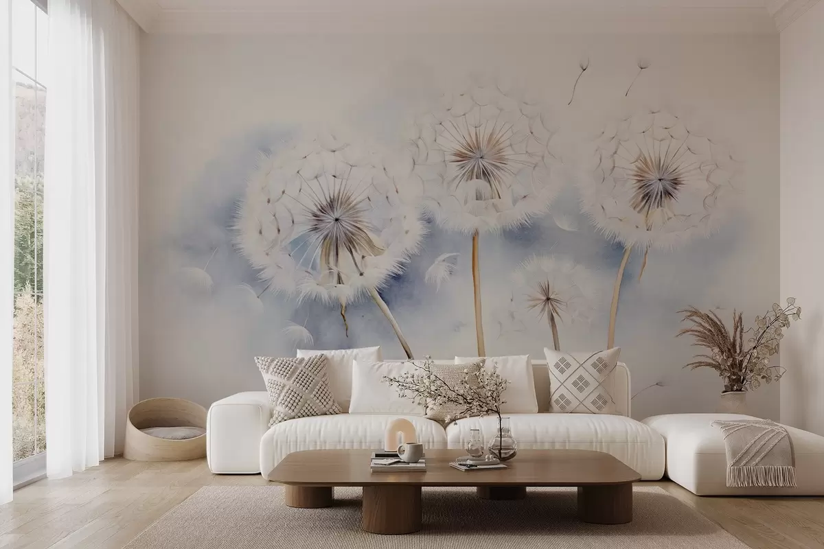 Fotobehang Gestructureerde paardenbloemen met zaden die in de lucht zweven, lichtblauwe en witte achtergrond, zachte delicate tekenstijl N° w09190