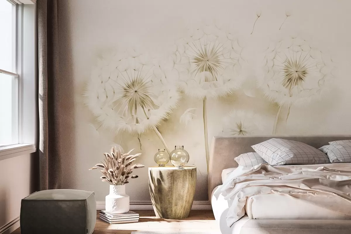 Fotobehang Gestructureerde paardenbloemen met zaden die in de lucht zweven, gedempte gele en witte achtergrond, zachte delicate tekenstijl N° w09190v1