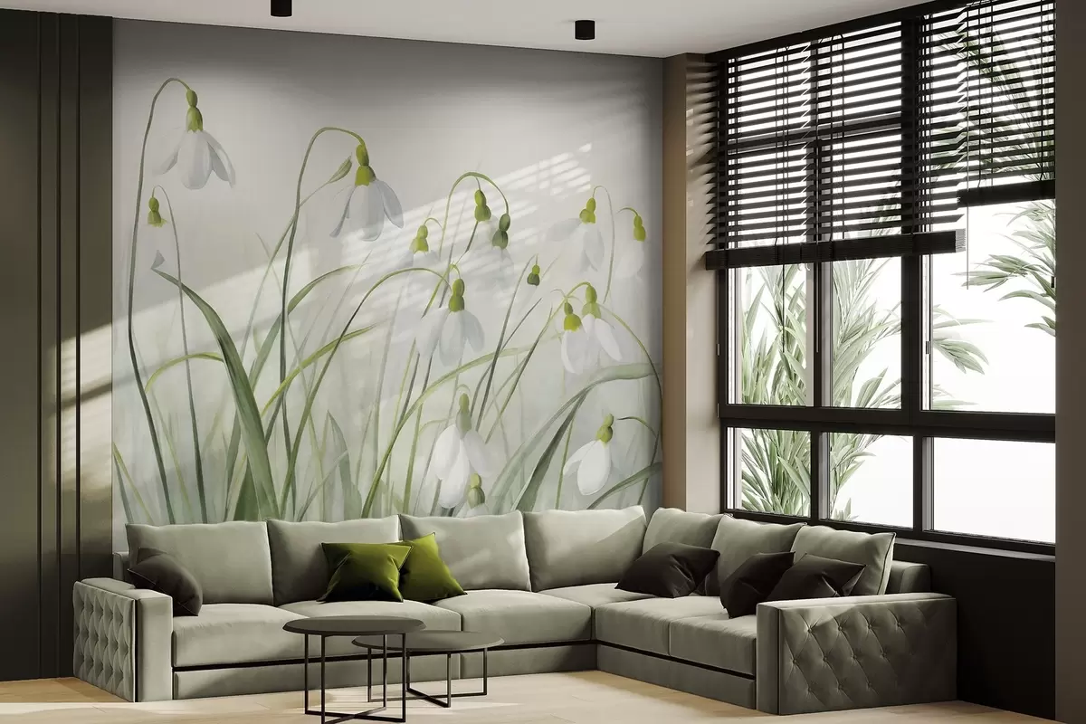 Fotobehang Sneeuwklokje bloemen met groene structuur stengels en bladeren, aquarel lente stijl, fijne penseelstreken N° w09195