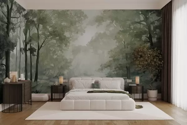 Fotobehang Boslandschap met structuur, bomen met groene bladeren, pastelkleurenpalet N° w09210v2