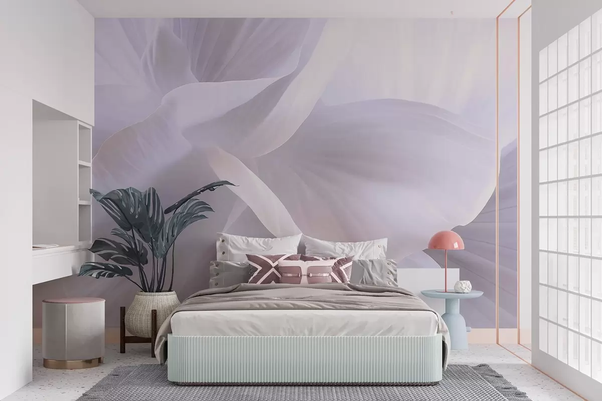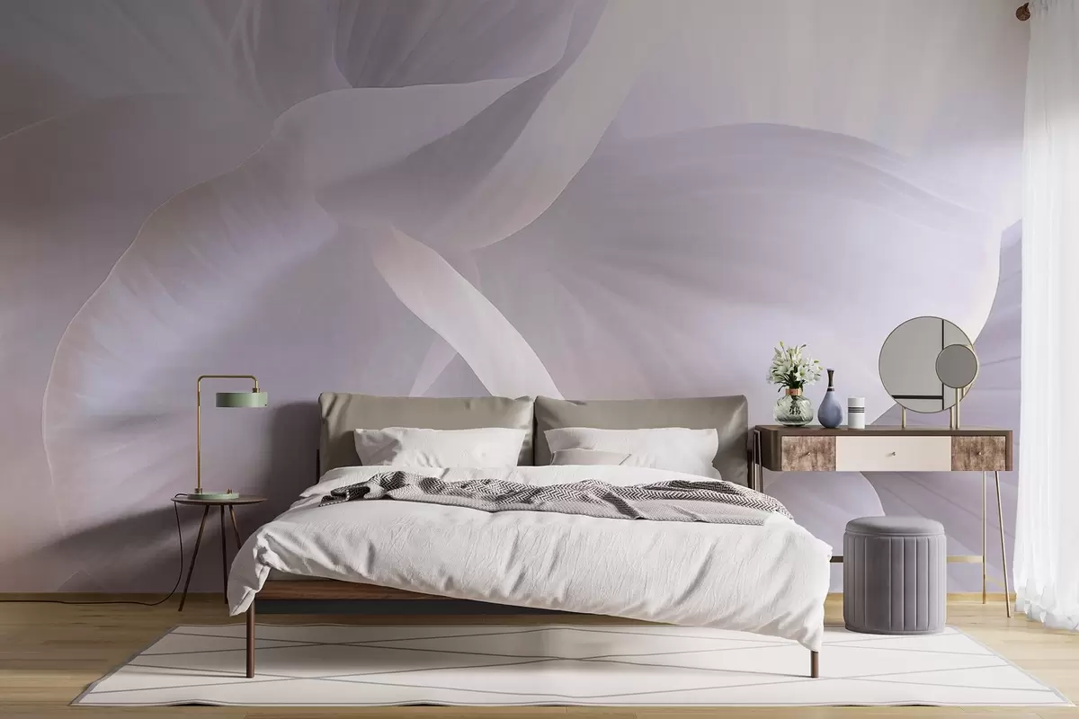 Fotobehang Abstracte getextureerde bloem met delicate bloemblaadjes, zachte verlichting, elegante compositie, minimalistische esthetiek N° w09211