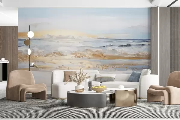 Fotobehang Abstract getextureerd landschap oceaan golven crashen op een zandstrand, zachte pastelkleuren, blauwe lucht met lichte wolken N° w09234