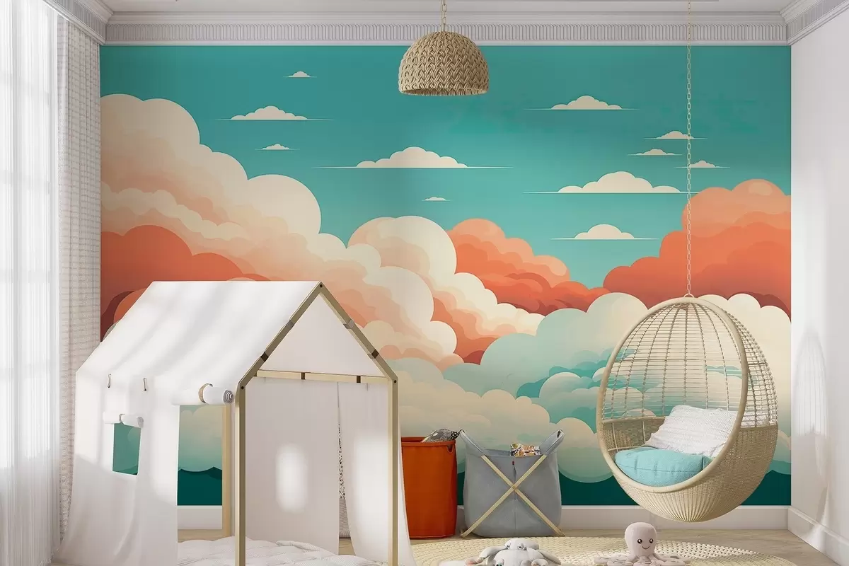 Fotobehang Grillige cartoonachtige wolken onder een blauwe hemel N° w09246