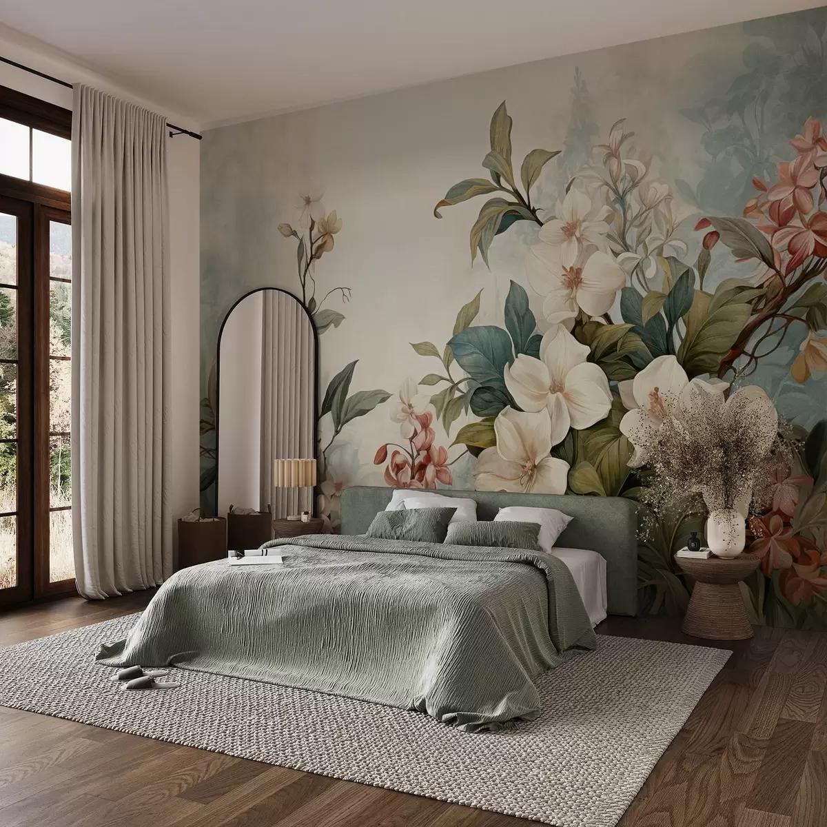 Fotobehang Gestructureerde tropische bloemen en bladeren met zachte blauwe en groene tinten, fijne penseelstreken, vintage botanische stijl N° w09259