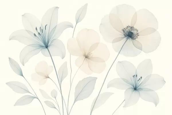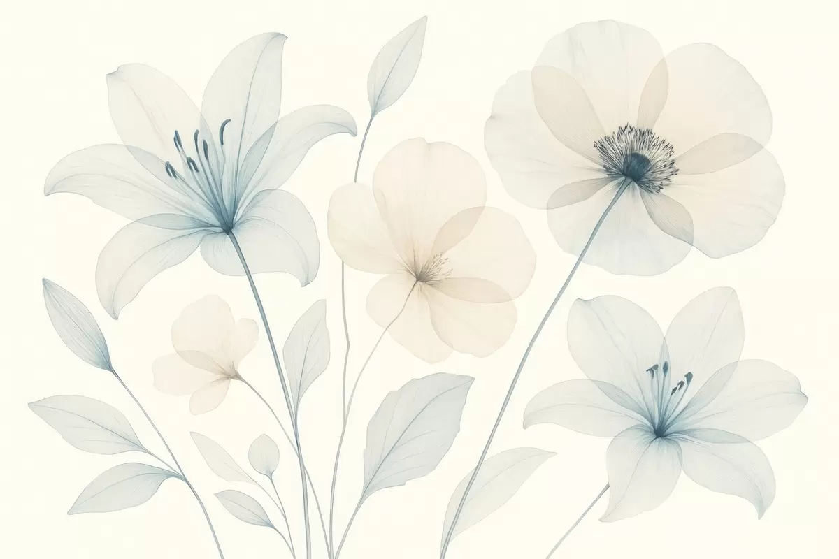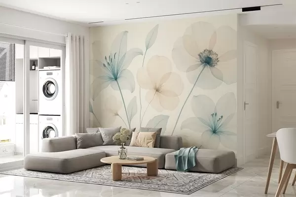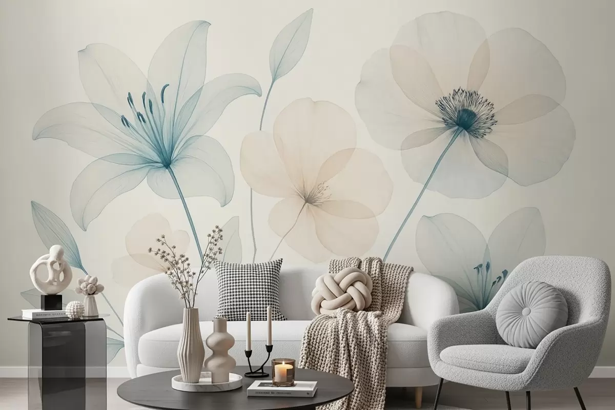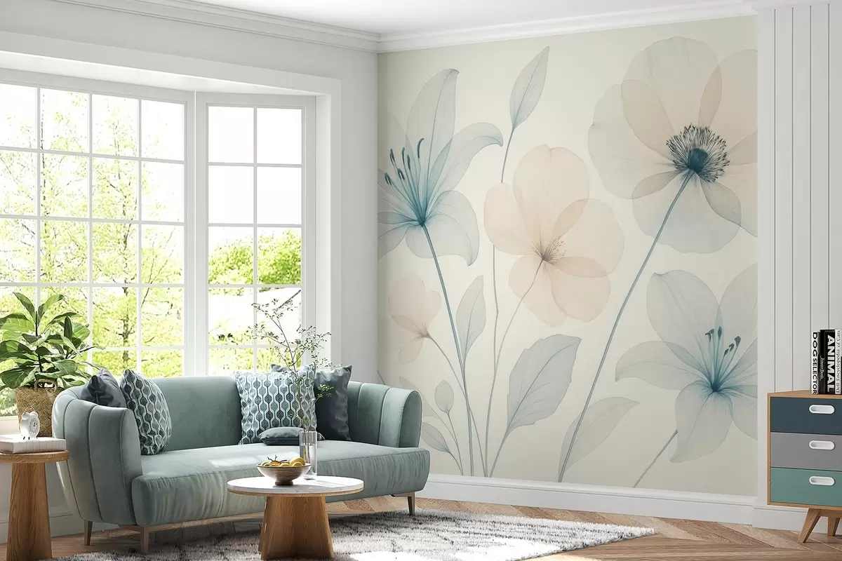 Fotobehang Delicate bloemen in pastelblauw en crème aquarelstijl N° w09287