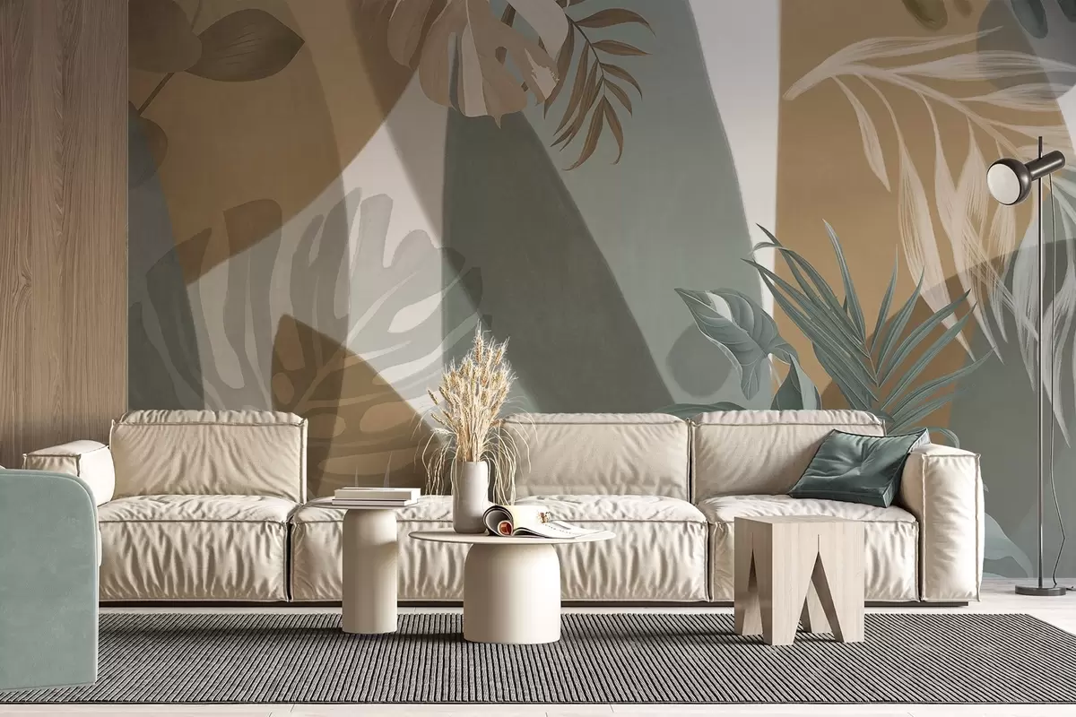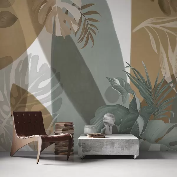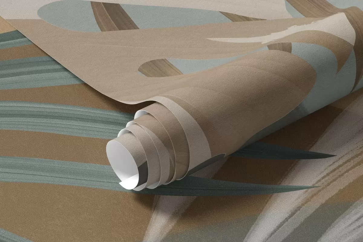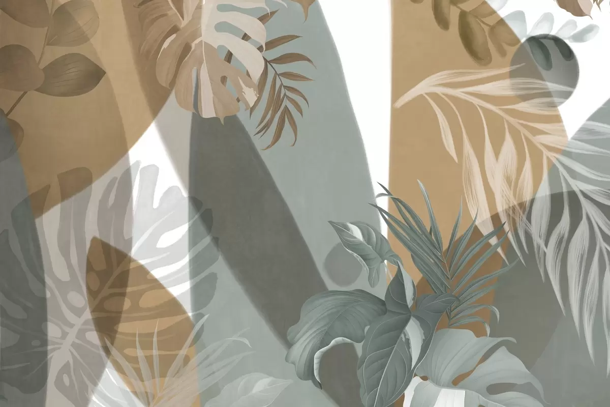 Fotobehang Monsterabladeren en palmbladeren in een patroon met bruine, witte en groene kleuren, tropische sfeer, abstracte vormen, decoratief N° w09288