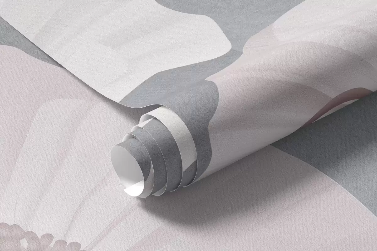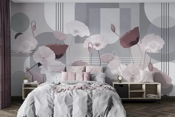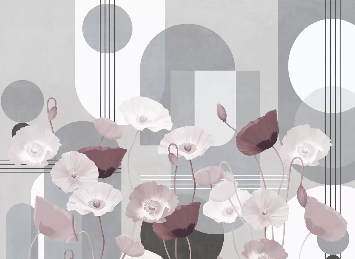Fotobehang Klaprozen in witte en grijze kleuren met geometrische vormen op de achtergrond, cirkels en bogen, minimalistische stijl, zachte kleuren N° w09289v1
