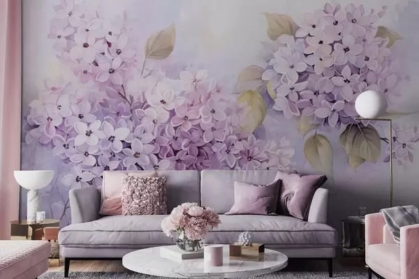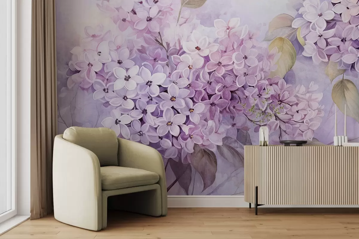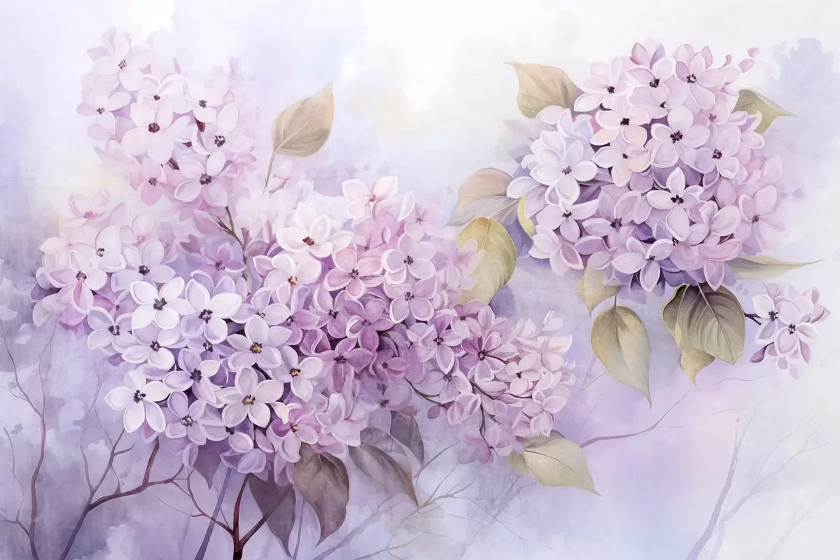 Fotobehang Lila getextureerde bloemen met lichtpaarse bloemblaadjes, lichtgroene bladeren, aquarelstijl, zachte pastelkleuren, fijne penseelstreken N° w09291