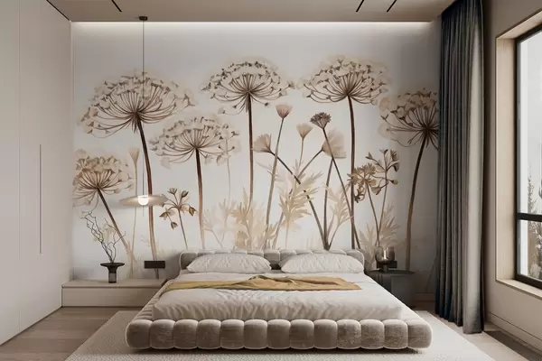 Fotobehang Queen Anne's Lace bloemen in een veld, getextureerd schilderij imitatie, bruin, beige en wit kleurenpalet, botanische illustratie N° w09294