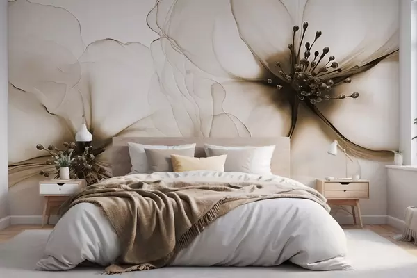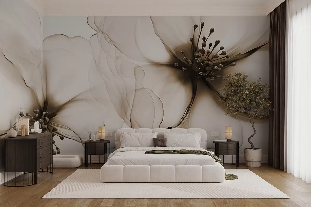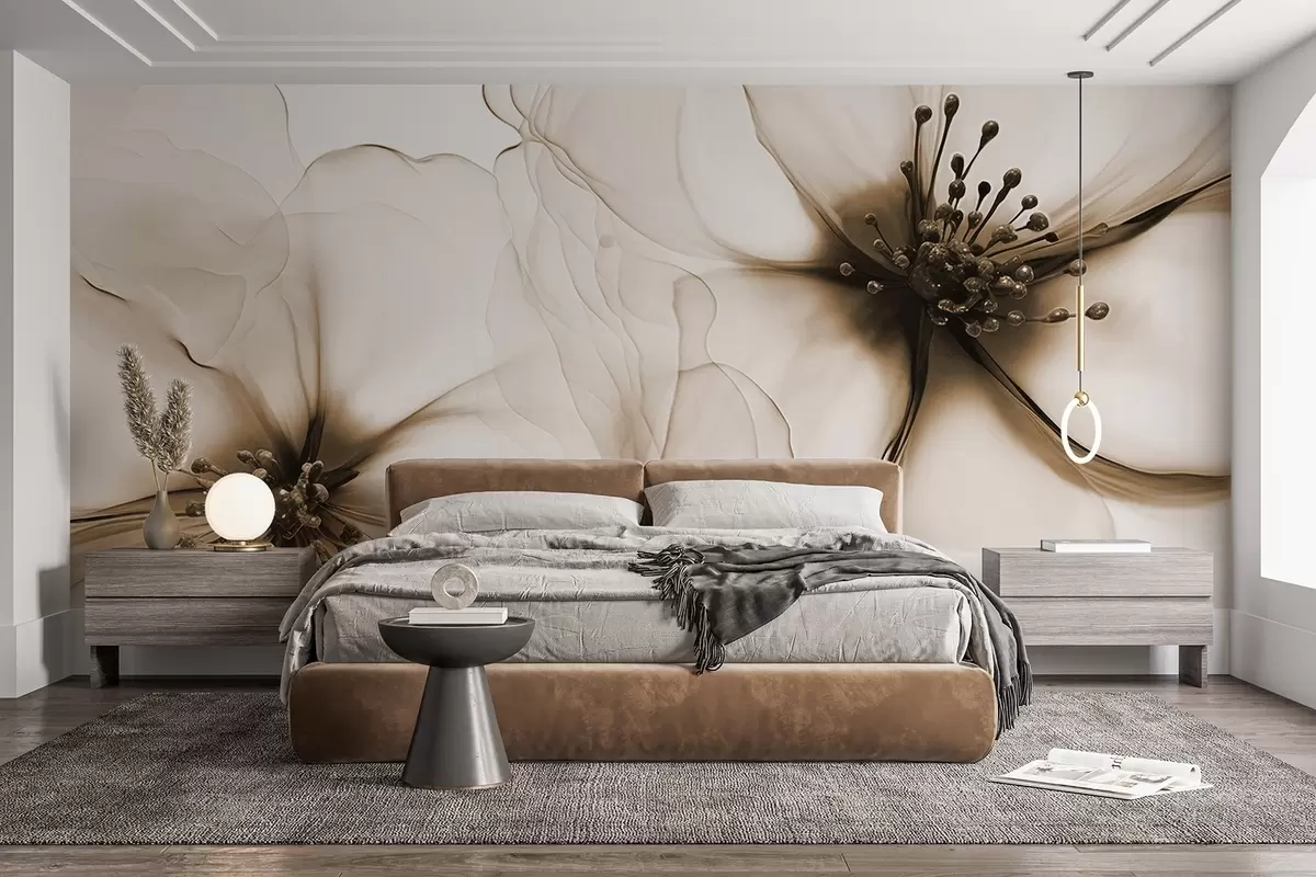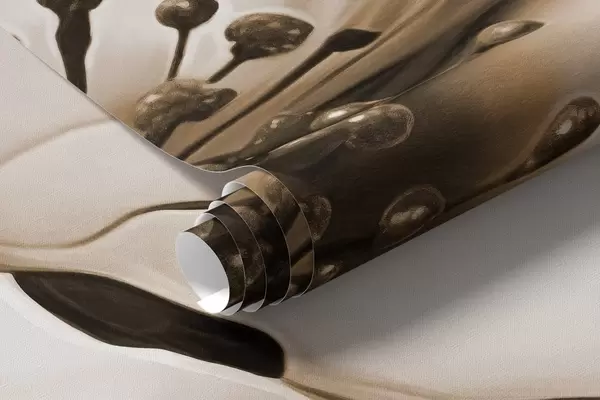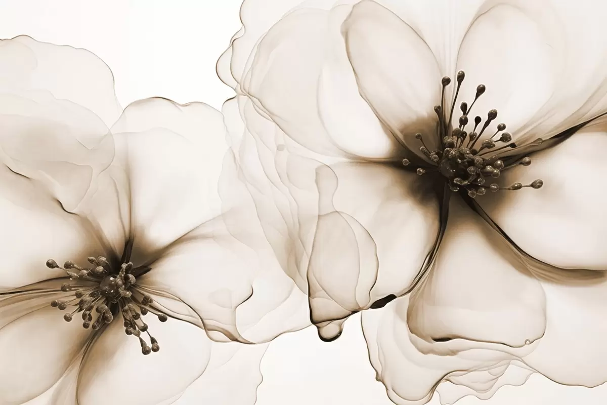 Fotobehang Twee doorschijnende bruine bloemen met zichtbare meeldraden, overlappende bloemblaadjes en een zacht vloeiende textuur N° w09295