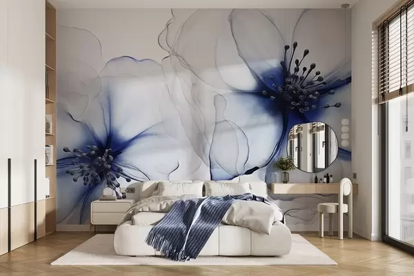 Fotobehang Twee doorschijnende blauwe bloemen met zichtbare meeldraden, overlappende bloemblaadjes en een zacht vloeiende textuur N° w09295v1