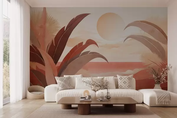 Fotobehang Tropisch abstract landschap met palmbladeren en een grote zon aan de hemel, warm kleurenpalet, minimalistische stijl, gestileerd N° w09296