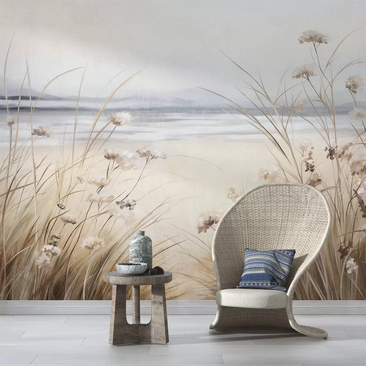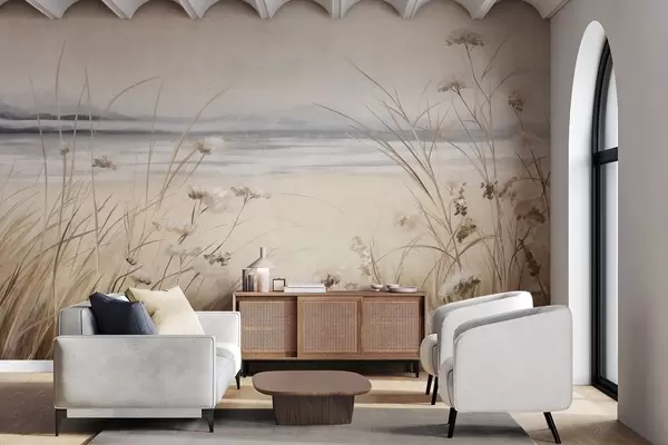 Fotobehang Een tarweveld met witte bloemen op de voorgrond, een strand en de oceaan op de achtergrond, neutrale pastel gedempte kleuren N° w09298