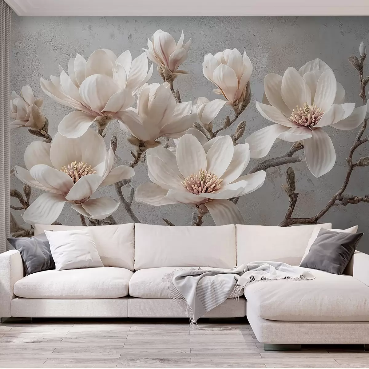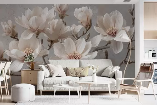 Fotobehang Magnolia takken met grote lichte bloemen in gedempte tinten N° w09305